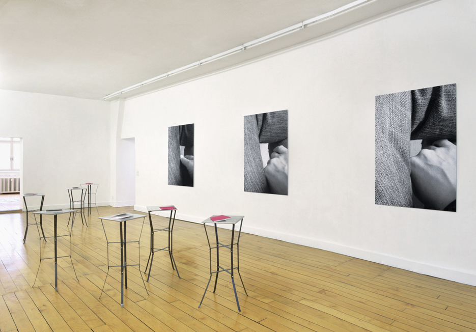 Ar and Or's moments (2010) 5 handgemachte Klapptische in Metall, je 98 x 64 x 54 cm (LxBxH), 5 Saalstühle, 5 Papierabzüge einer Fotografie (je 30 x 42 cm), A4-Textblätter in einer deutschen, arabischen und
