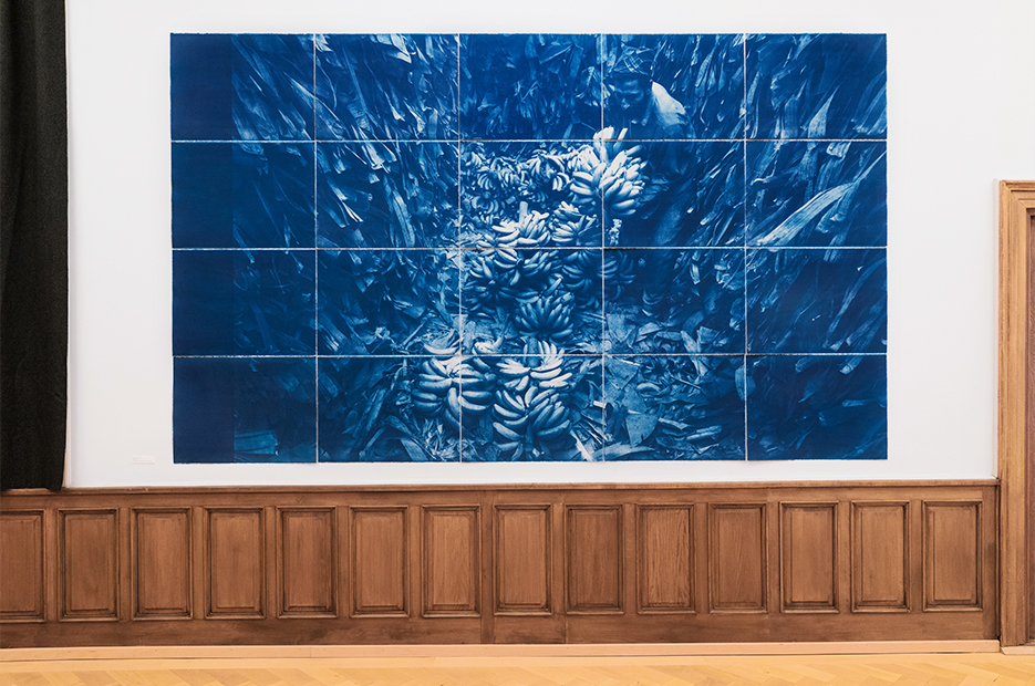 Cyanogarten 5 (2017/2021) Fotografisches Raumbild, 65-teilig, Cyanotypien auf BFK-Rives, Blatt je 56.5 x 76 cm, Gesamtbild 285 x 615 cm, Ausstellungsansicht Kunstmuseum Olten 2021 (Foto: Kaspar Ruoff)