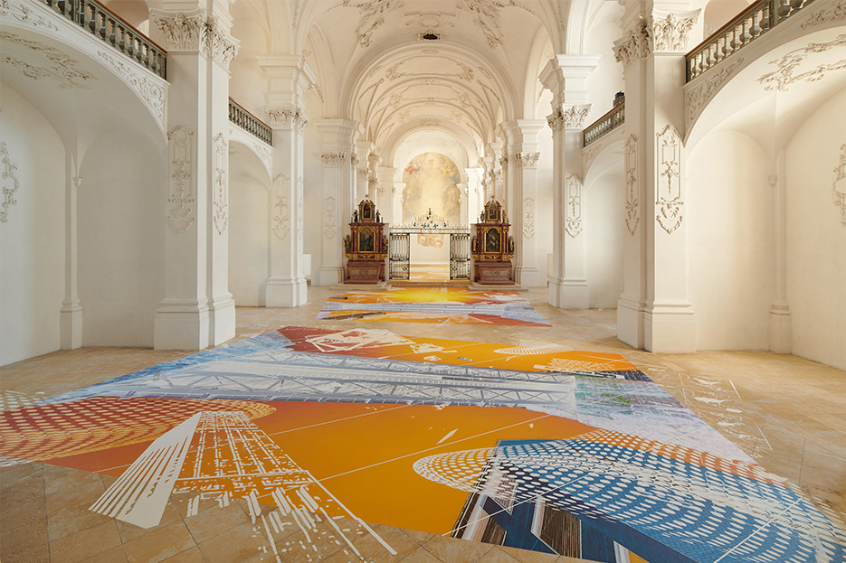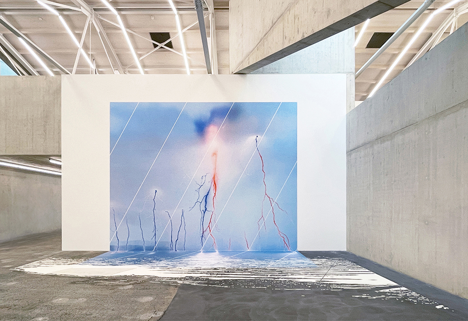 Bildarchiv, Ausstellungsansicht 2012, Aargauer Kunsthaus, Aarau (Foto: David Aebi) Ader (2024) Raumvariable Wand-Boden-Installation, Fototapete, von Hand angefertigte Bodenfarbe aus Kreiden, Jurakalk, Wasser, Gummiarabicum, pulverisiertes Schmerzmittel